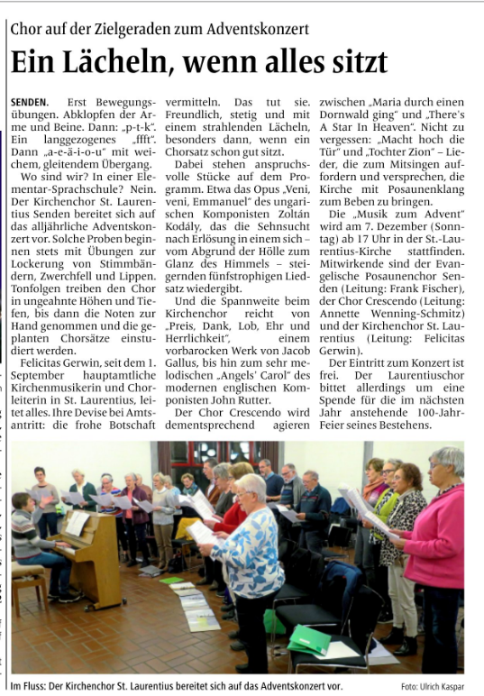 Dazu die Seite des Kirchenchores: https://kirchenchor-st-laurentius-senden.jimdosite.com/news/ Redaktionell verantwortlich: Ulrich Kaspar