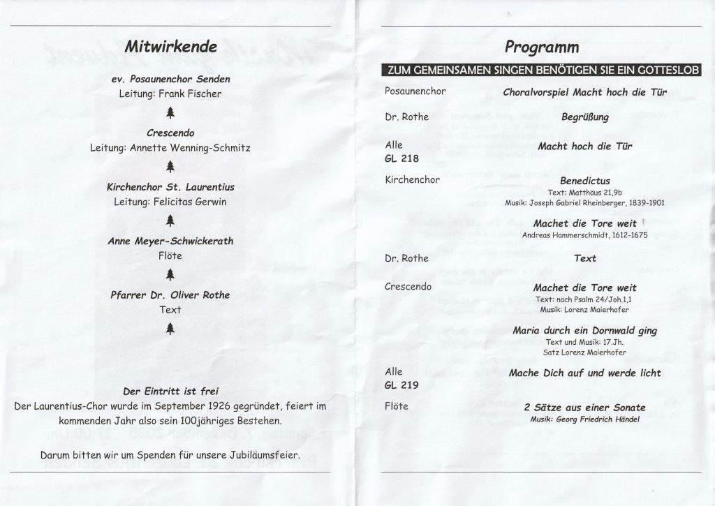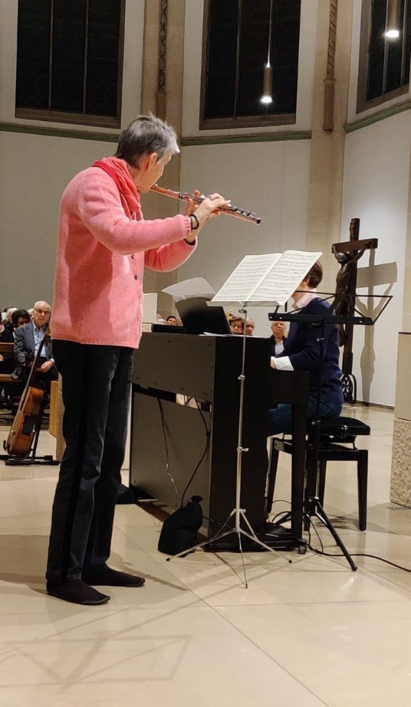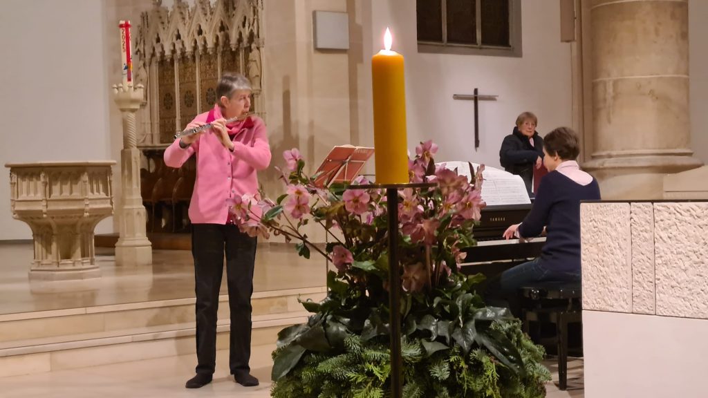Besucher strömen in die Kirche. Es wird ein guter Besuch.Mit ein wenig Lampenfieber warten wir auf den Einsatz.Anne und Felicitas übernehmen erstmalig den Flötenpart. Marita und Frau Gennert-Stöcker hatten hier Spuren hinterlassen. Ein neuer, schöner Anfang!